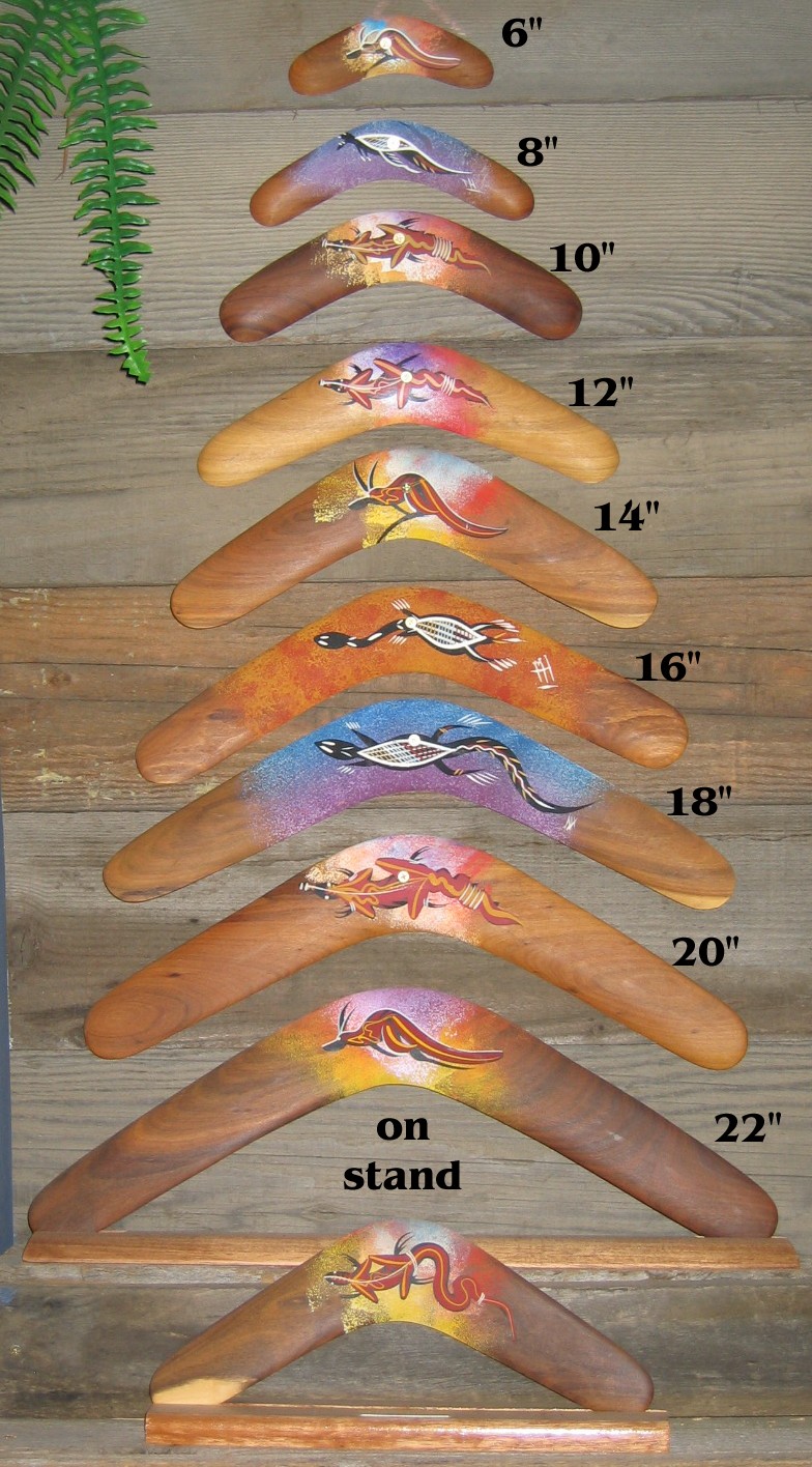 Standard boomerangs![]() Hardwood boomerangs, hand painted by Aboriginal artists Bigger image (234K) |
